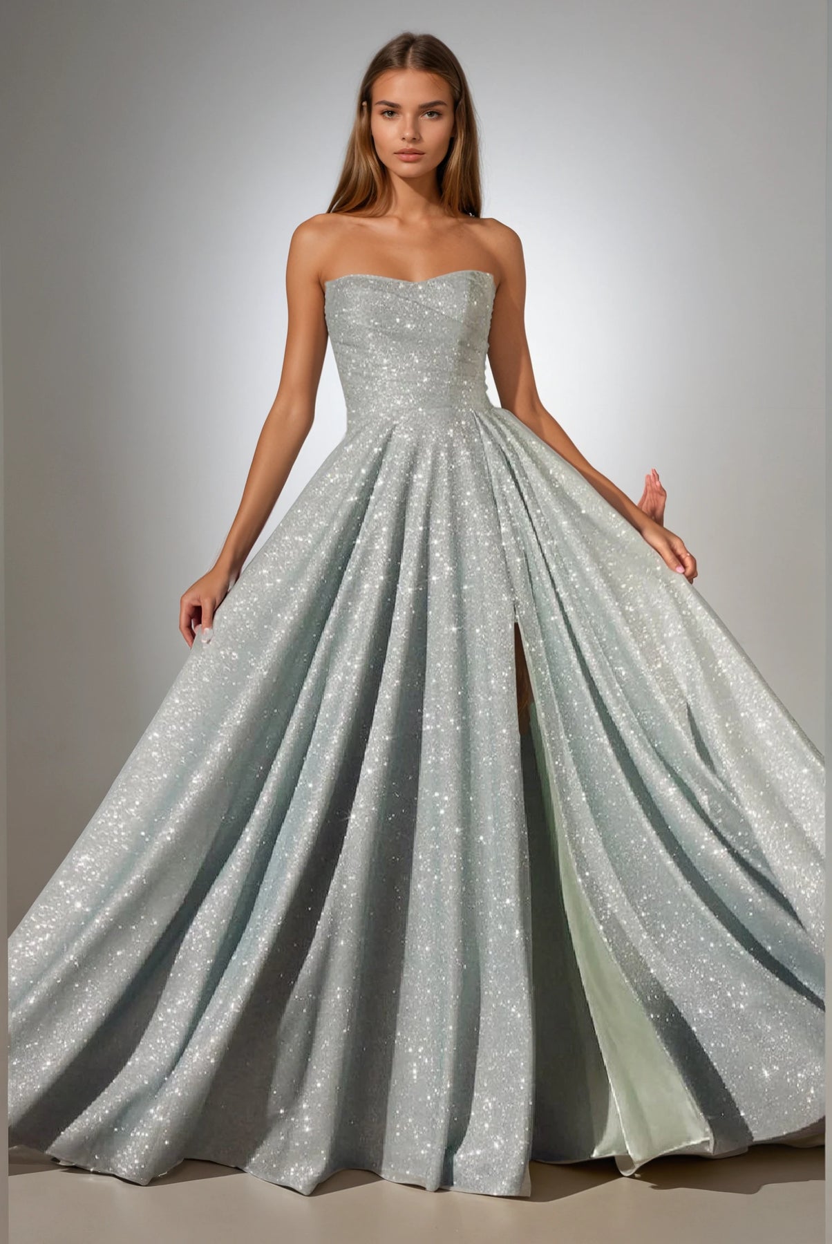Regular price €250.00This enchanting A-line gown shimmers with every step, featuring a strapless scoop neckline and a delicately gathered bodice for an effortlessly elegant look. The pleated skirt flows beautifully, enhanced by a leg slit for a hint of drama, while the lace-up corset back ensures a perfectly sculpted fit. Crafted from glitter-dusted fabric, this gown is a radiant choice for prom or any formal occasion.