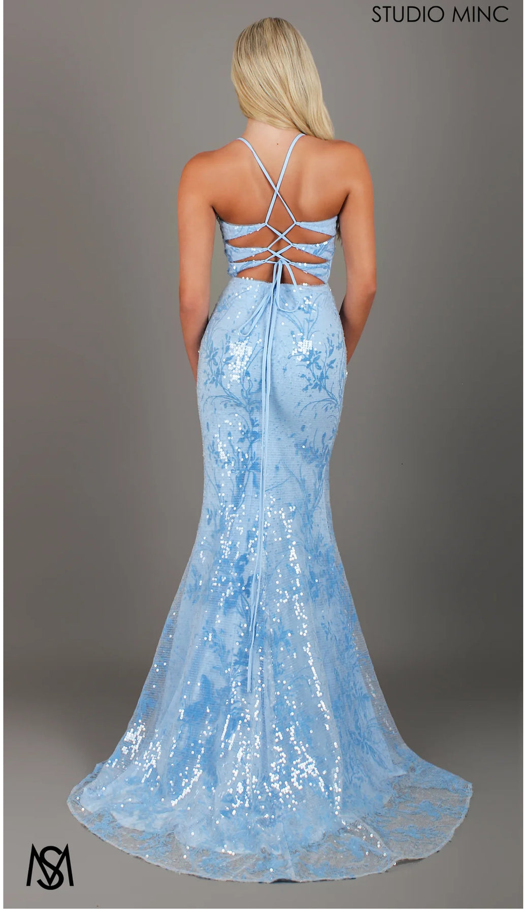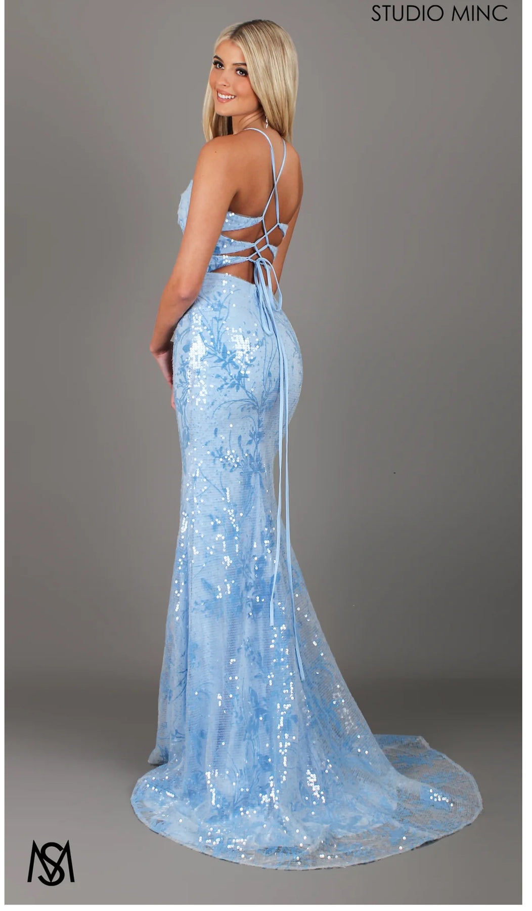 The 'Peony' Formal and prom dress features a one-of-a-kind printed floral sequin. This stunning silhouette features built in bra cup corset style bodice with pleated bust drapes. The dress has a mermaid silhouette with striking lace up back design.