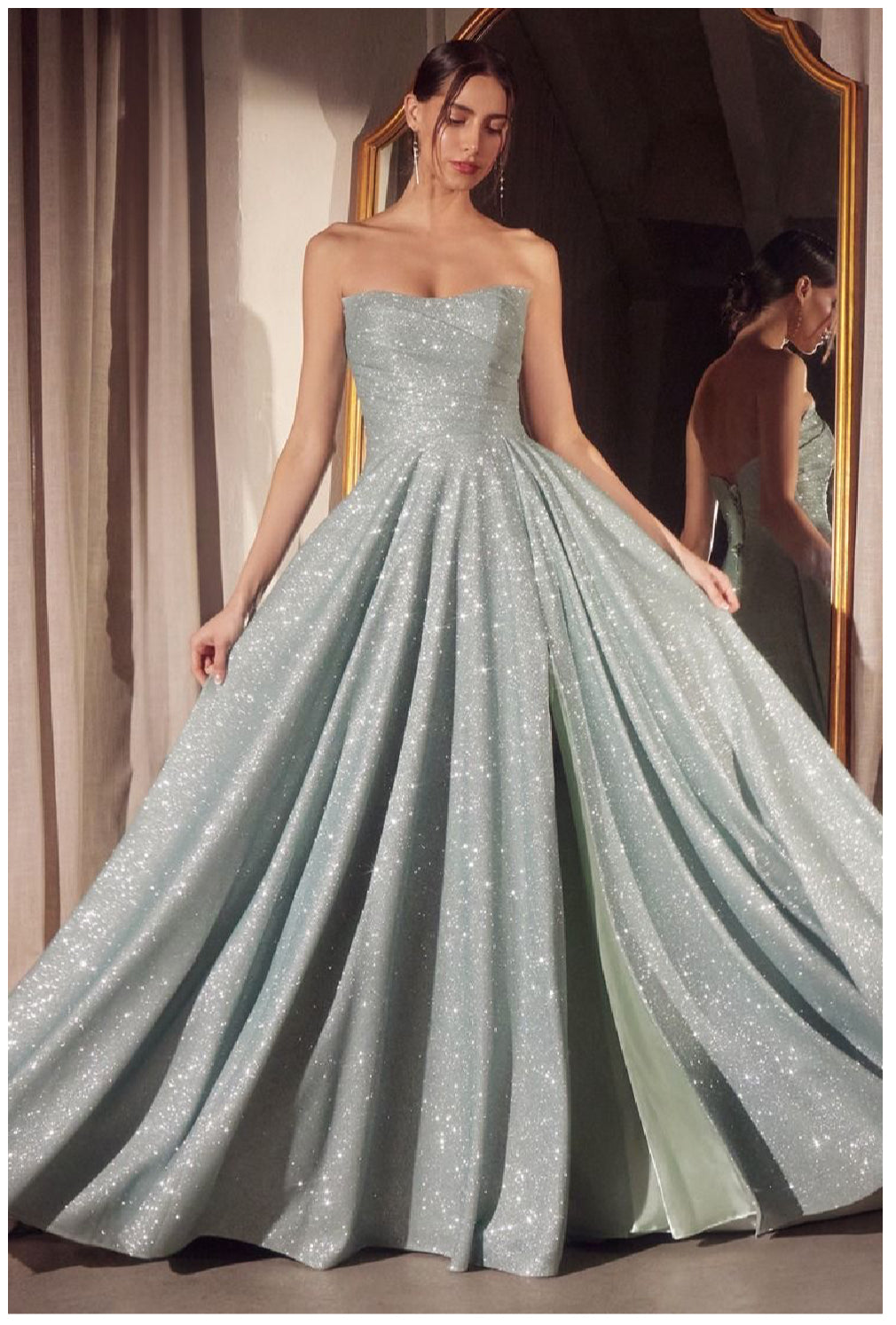 Regular price €250.00This enchanting A-line gown shimmers with every step, featuring a strapless scoop neckline and a delicately gathered bodice for an effortlessly elegant look. The pleated skirt flows beautifully, enhanced by a leg slit for a hint of drama, while the lace-up corset back ensures a perfectly sculpted fit. Crafted from glitter-dusted fabric, this gown is a radiant choice for prom or any formal occasion.